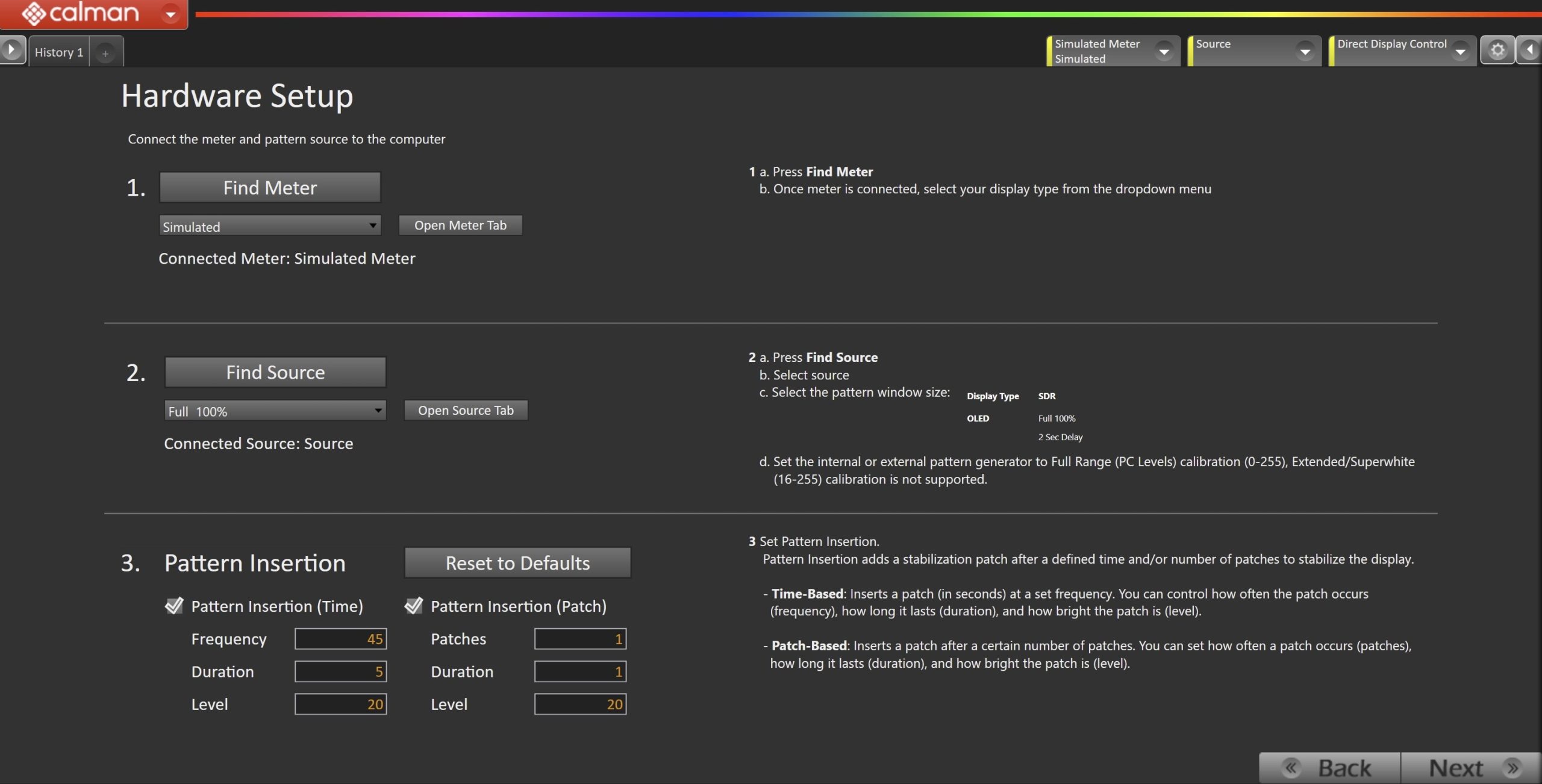 - Click the Reset to Defaults button to set the appropriate pattern insertion for the display and calibration type in Step 1