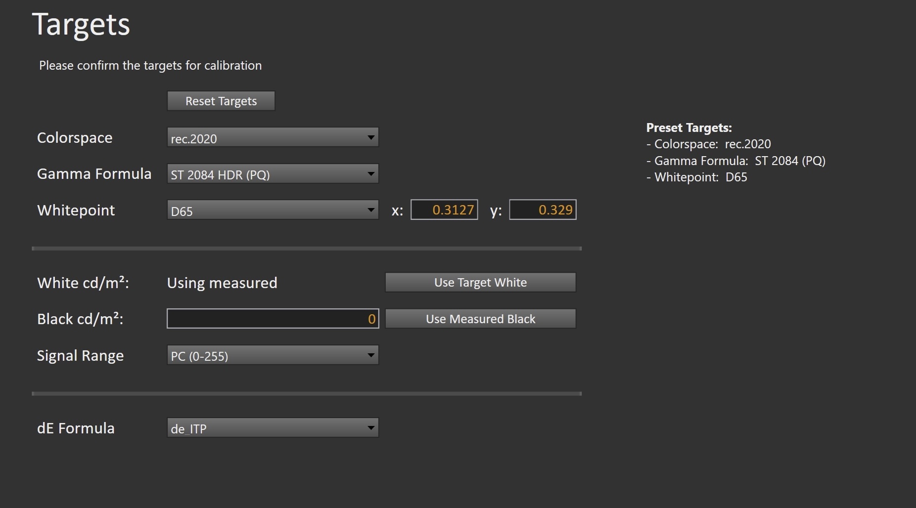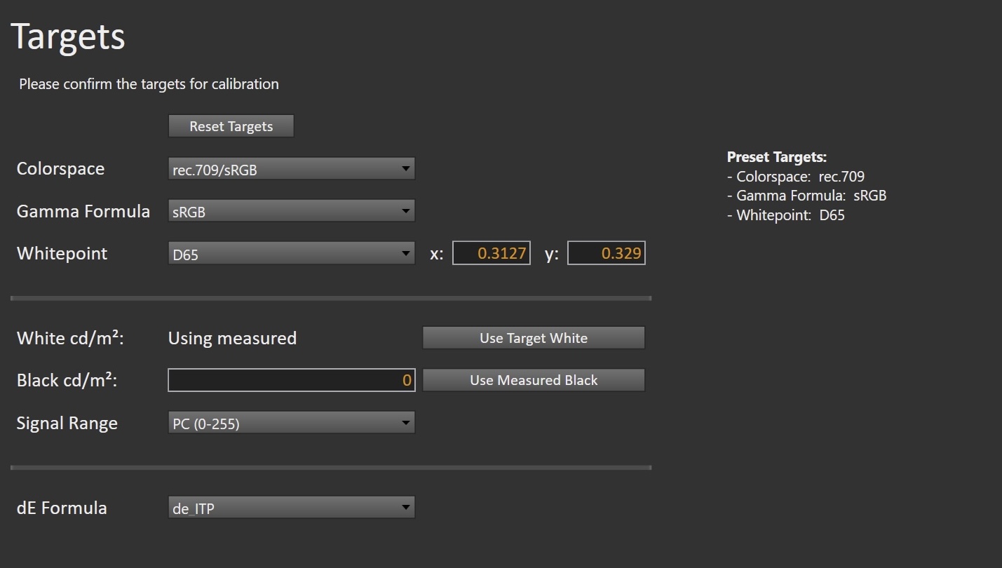 - Confirm/configure your calibration targets. These will be automatically set to common defaults by the options from Step 1