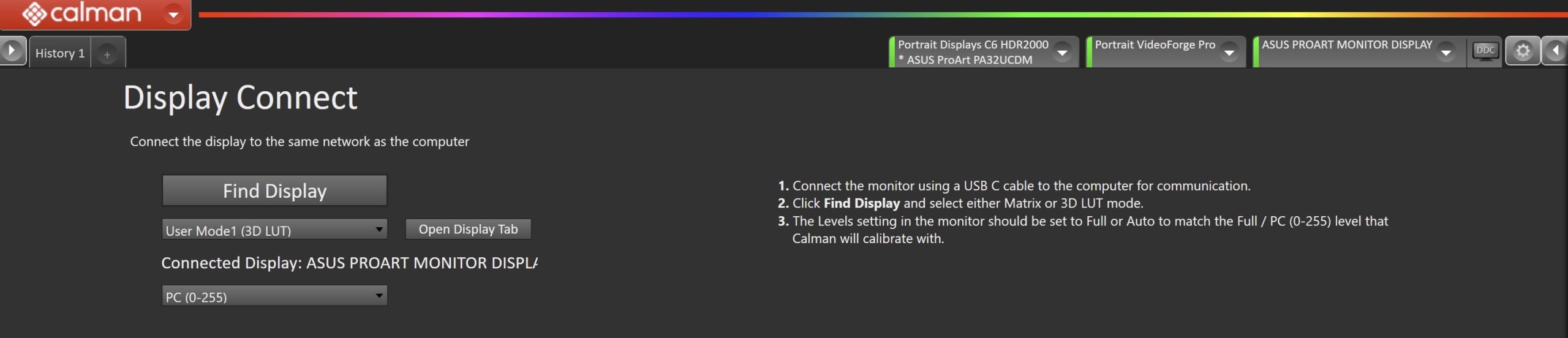 - Note: The Levels setting in the monitor should be set to Full or Auto to match the Full / PC (0-255) level that Calman will calibrate with.