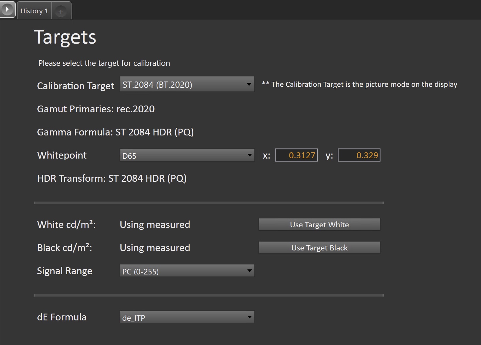 - Select your desired calibration targets, these will vary based on your SDR or HDR choice in Step 1