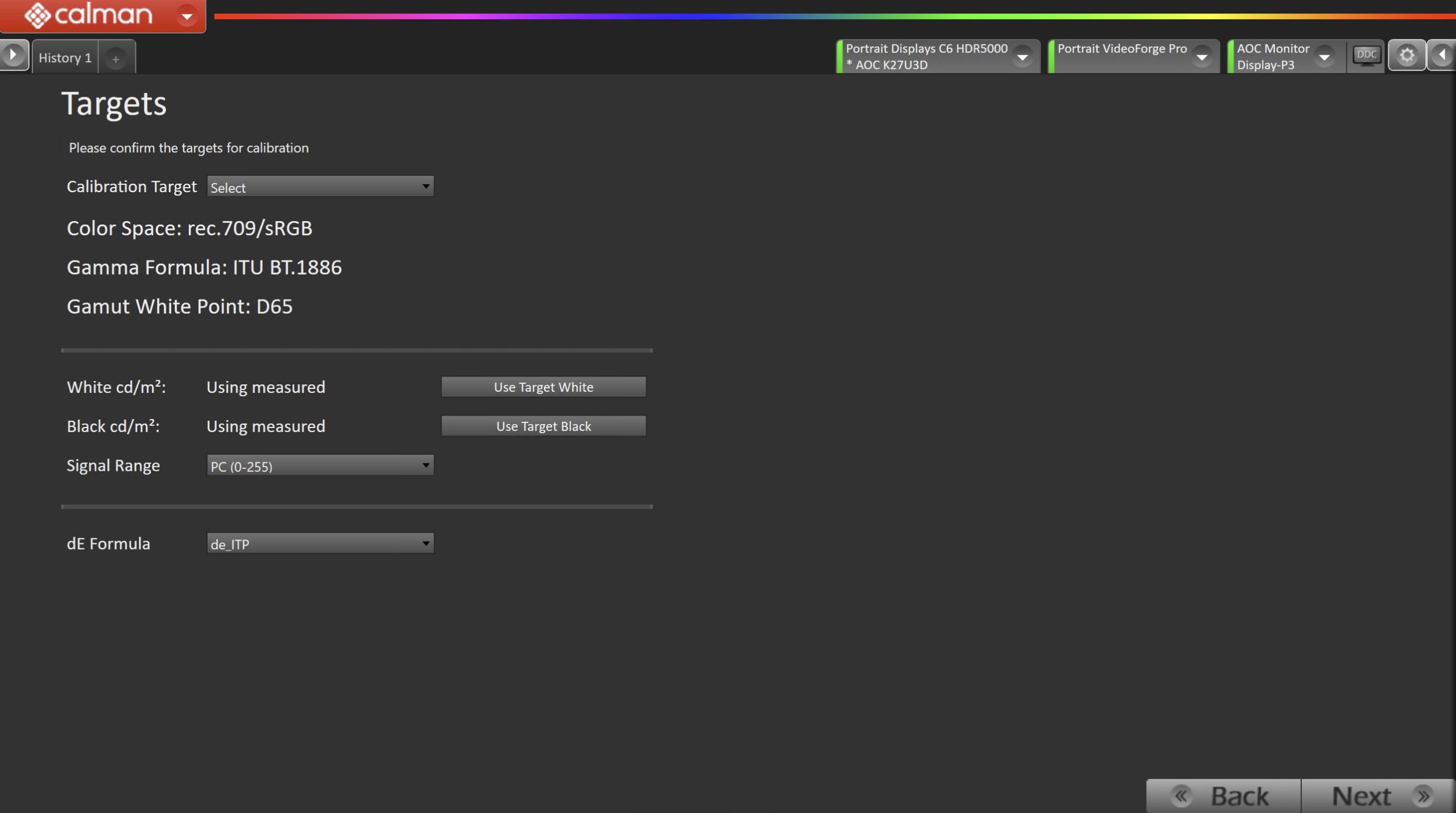 - Confirm/configure your calibration targets. These will be automatically set to common defaults for the selected target.