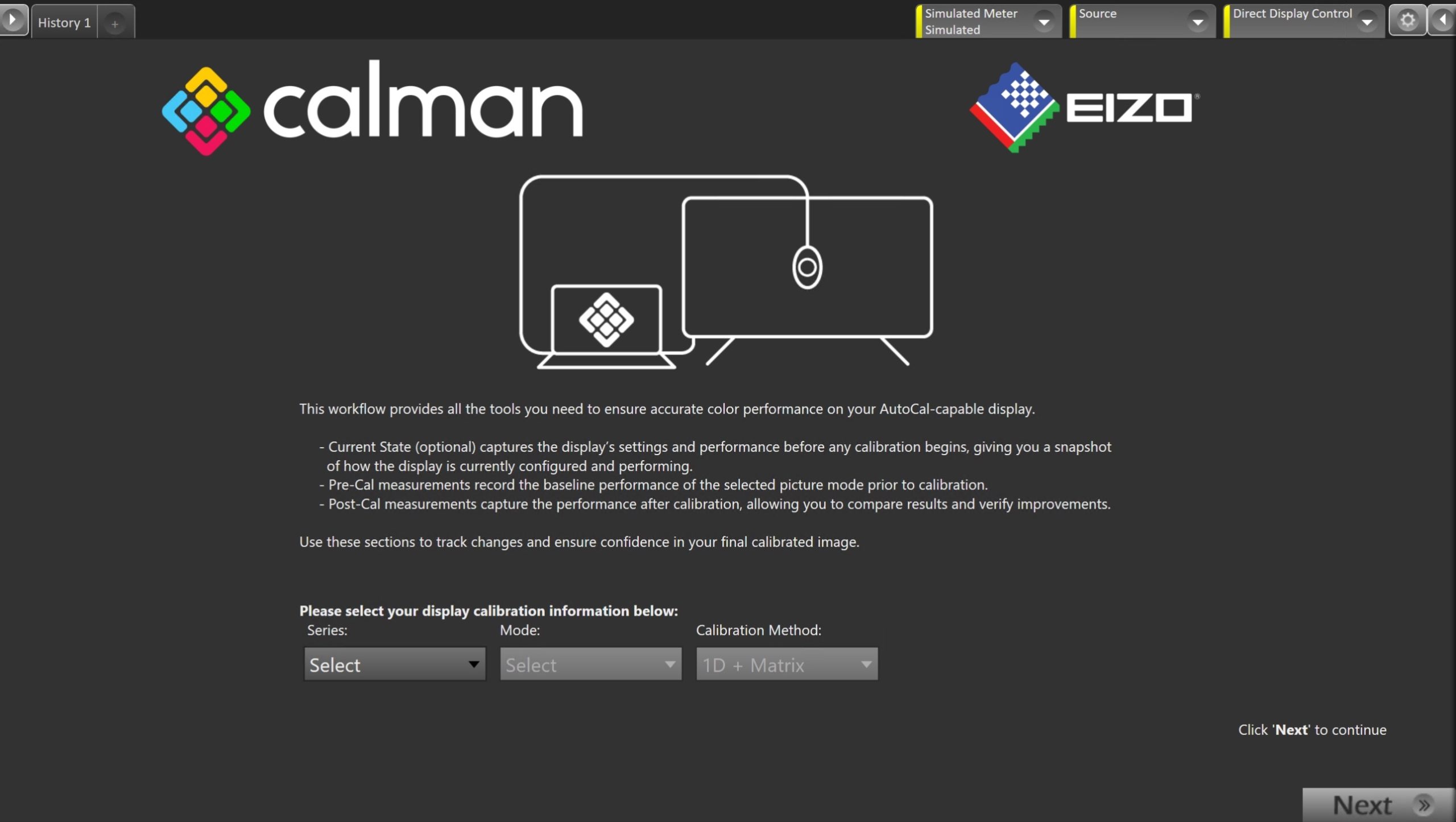The EIZO Monitor Calibration workflow in Calman provides automated calibration for supported EIZO models. Depending on the monitor’s capabilities, Calman can load a full 3D LUT directly into the display or apply a 1D LUT paired with a color correction matrix. This workflow guides you through configuring your targets and performing accurate calibrations using the monitor’s internal processing.